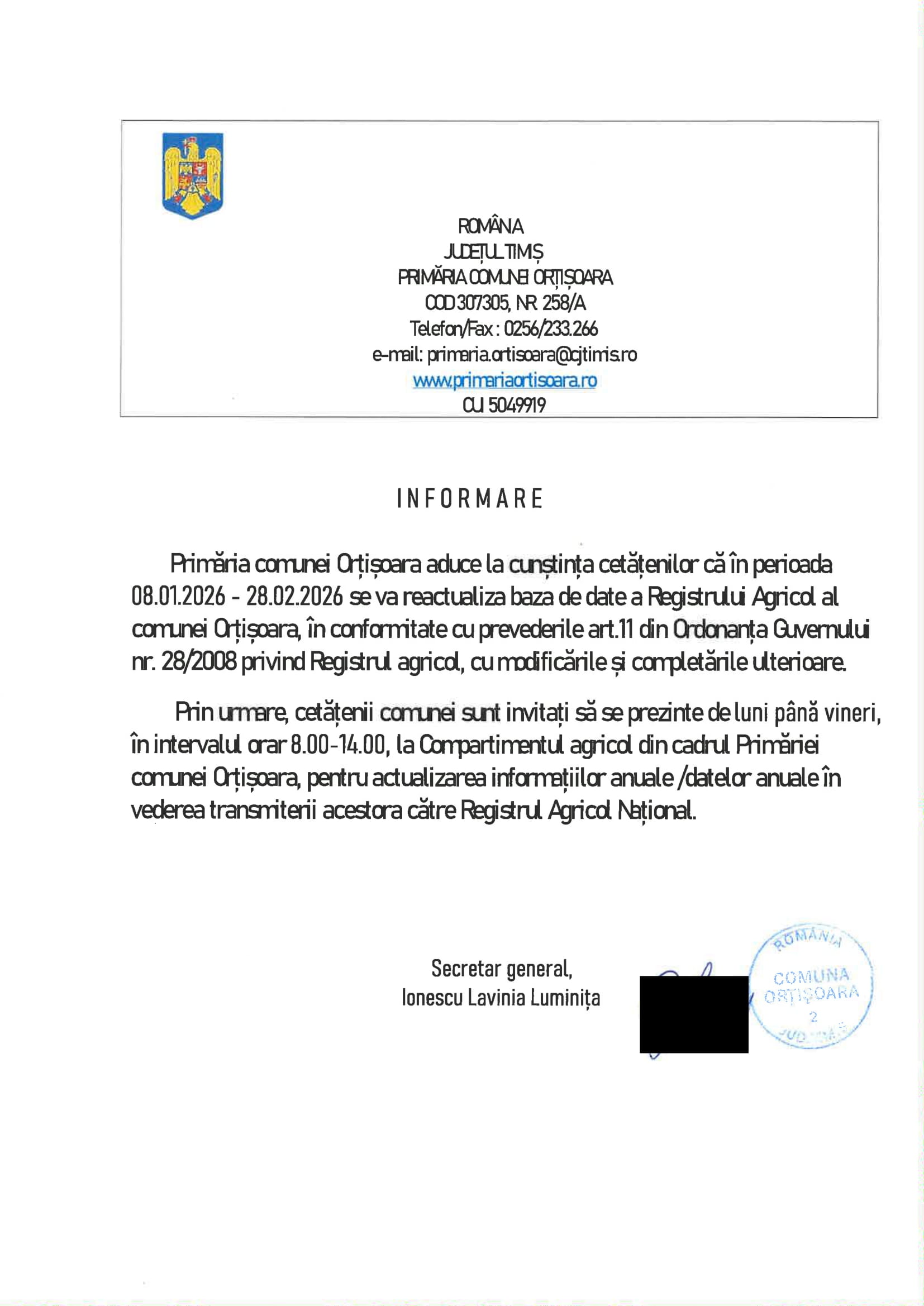 Primăria Comunei Orțișoara informează cetățenii că, în perioada 22 decembrie 2025 – 8 ianuarie 2026, programul cu publicul va fi modificat, după cum urmează: Ultima zi de program cu publicul: luni, 22.12.2025 Reluarea activității cu publicul: joi, 08.01.2026...